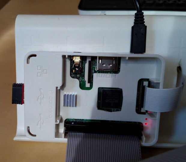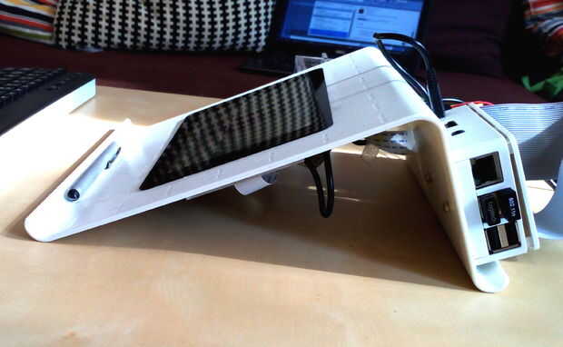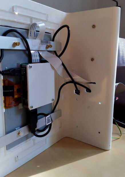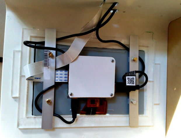 Ahora fije el caso Pi el modificado "Isberget" y coloque su Pi. Luego coloque la pantalla táctil en el corte, por favor busque la orientación correcta y arreglar con las dos vigas de aluminio. Ahora conecte la conexión de la pantalla táctil y los cables de USB a Pi y pantalla táctil.