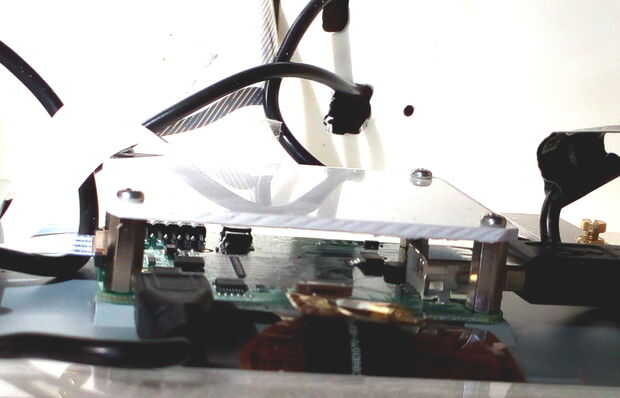 Para proteger la electrónica del controlador de pantalla táctil, una placa plástica de 5.8 x 6.6 cm fue atada a la pantalla táctil con el espaciador suministrado elementos y tornillos M2.5.