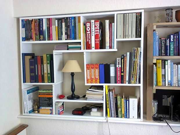 tuve un montón de estantes sin usar y piezas cortadas de otros y decidí hacer una estantería contenido con ellos. Quería diseñar, significa que las piezas se mantendría la misma longitud en lo posible para que tendría que encajan en cualquier manera él podría.