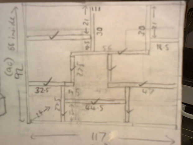 tenía que tener un juego alrededor con las otras piezas que tuve que encajaría. La unidad fue principalmente sostener libros y álbumes de fotos, así que allí necesitado ser algunos espacios más grandes que otros. Medí la altura de las cosas que quería almacenar y planificar los estantes alrededor de eso. Esto es lo que se me ocurrió. Lo siento es un poco borrosa pero se pueden ver las medidas en centímetros (no hacer pulgadas). Las garrapatas demostraron Cuáles son las piezas que tenía listo. Para estos últimos que necesitaba otros hacia abajo para ajustar.