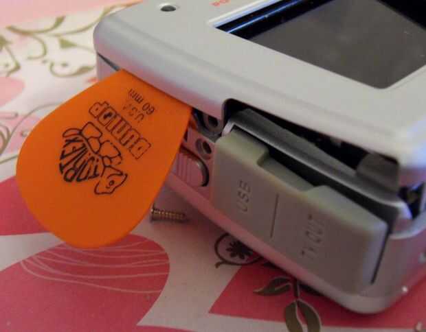 Para ello puede usar sus uñas, o lo que preferiría una púa. Esta pequeña cosa plástica que se utiliza para tocar la guitarra. Son baratos, rígidas y lo suficientemente pequeño como para ir entre las tripas.