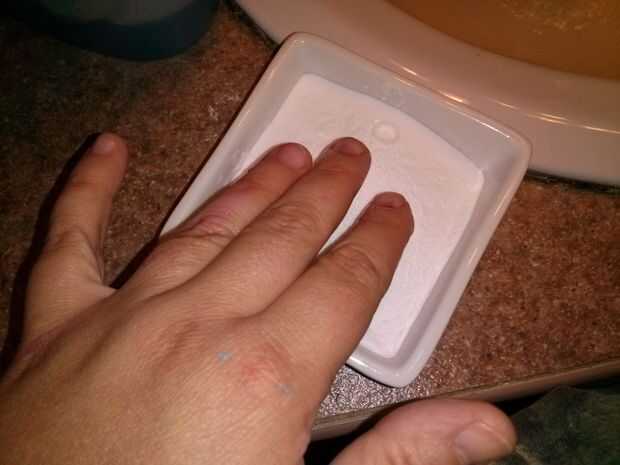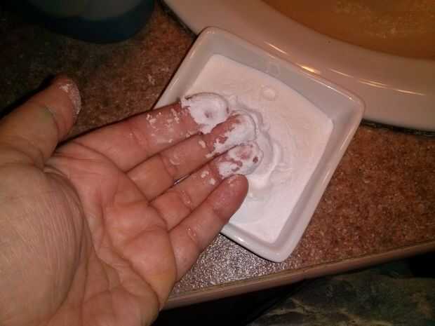 Sumerja mojados dedos en bicarbonato de sodio. Esto hará una pasta en los dedos. * Puede ajustar la consistencia a tu gusto con más o menos agua.