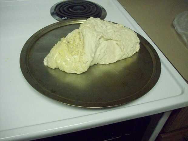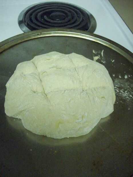 Después de unas 3 horas de ascenso, la masa estará lista para ser formado para la cocción. Rocíe una bandeja para hornear con aceite antiadherente en aerosol. Dividir la masa en dos partes iguales y cada uno en una bola de rodillo. Cortar una tabla de Tic-Tac-Toe en cada bola, para que el vapor se puede dejar hacia fuera mientras que está en el horno, como la foto de arriba. Polvo de la parte exterior de cada bola con un poco de harina.
