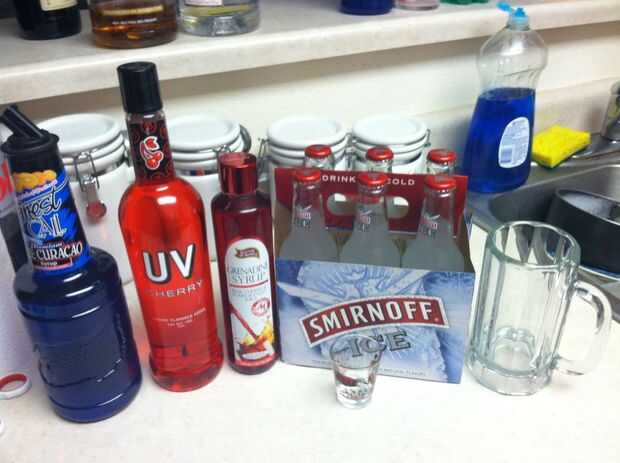 Personalmente usé UV cereza para el vodca pero funcionará cualquier vodca con sabor a cereza. Todo esto solo cuesta cerca de $30 y será fácil hacer diez bebidas. Si más bebidas se necesitan comprar más hielo de Smirnoff. También he escuchado de otra receta para esto que sustituye UV azul para el Curacao azul, por lo que también es una opción.