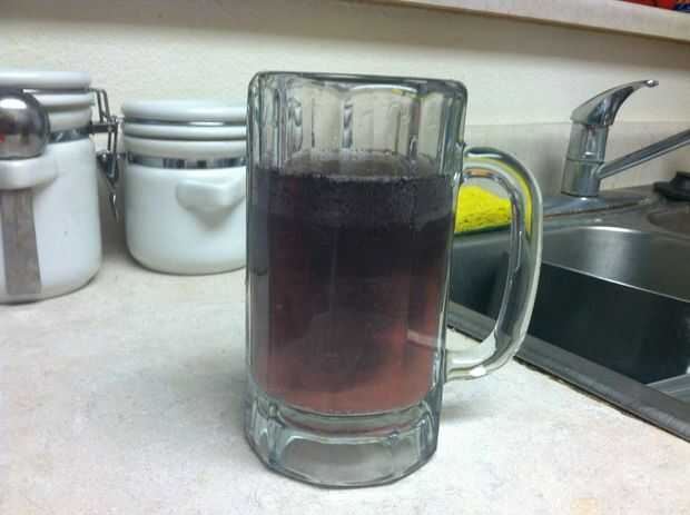 Finalmente, el vidrio de tiro de la gota en la taza. La bebida será azul oscuro, blanco en el centro y rojo en la parte inferior. Esto no dura mucho y los colores pronto comenzará a mezclar. Este gran gustos de bebidas cuando se consume a cualquier velocidad, así que consume a su propio ritmo.