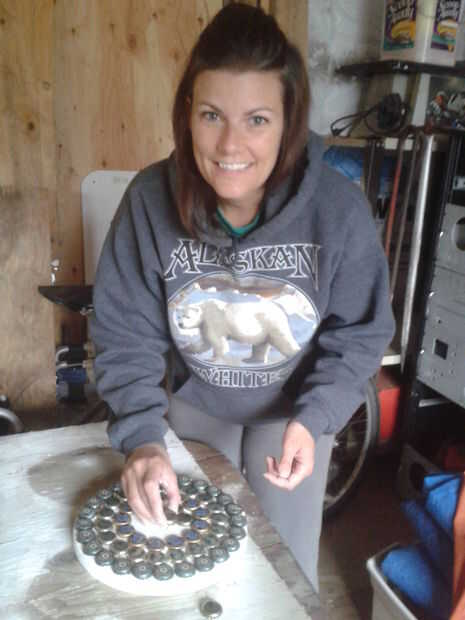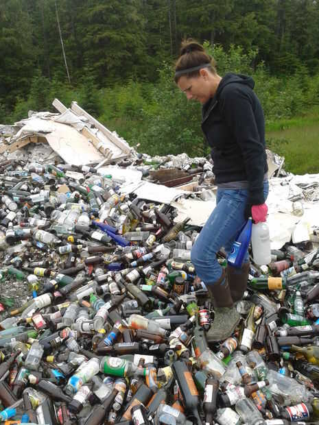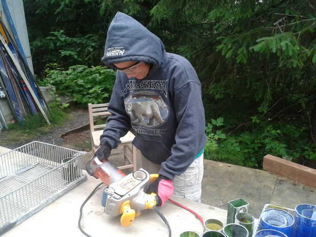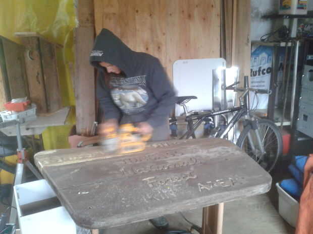 Aquí están algunas fotos de pimienta recuperación botellas para cortar vidrios, lijado de gafas, una muestra recuperada para una mesa de lijado y colocación de tapas de botellas en un taburete a la lechada.