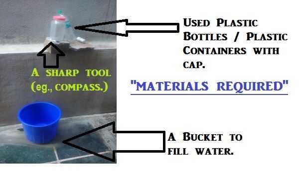 Mi suegro descubrió una manera de reutilizar botellas o para riego por goteo. Esto es cómo. Los materiales son botellas vacías, palillo de bambú, hisopo de algodón (bastoncillos de algodón) y cadena. Las herramientas son de tijera, pinza, clavo, cuch