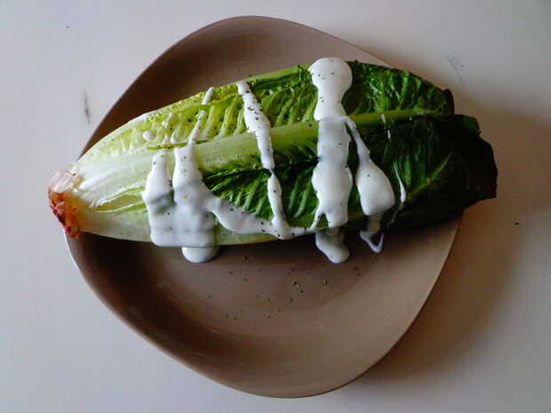Precalentar el horno a 350 grados. Limpiar el corazón de lechuga romana y la capa en la pimienta. Cocinar durante 5-10 minutos. Luego servir con aderezo ranch. Encima con el perejil como adorno.