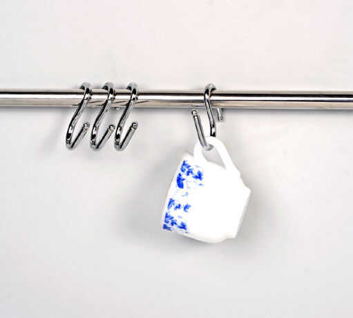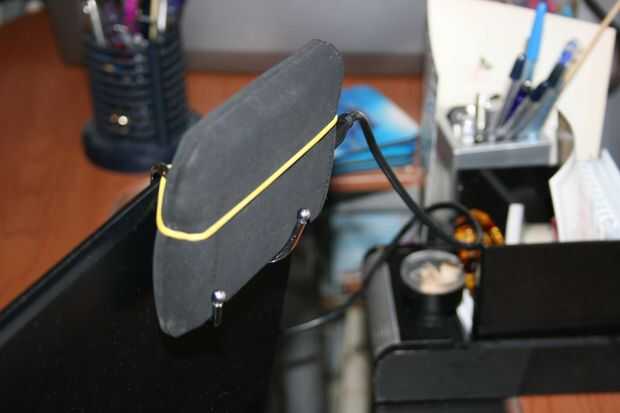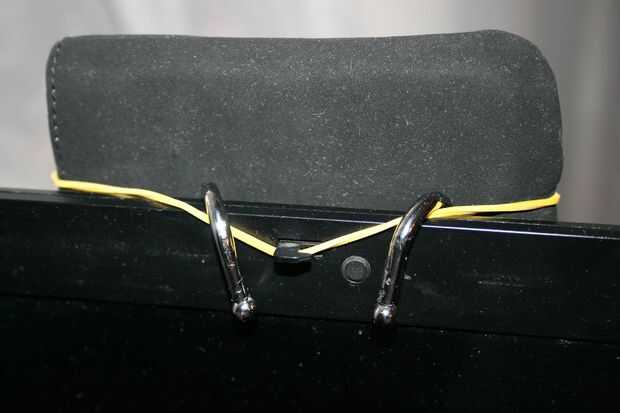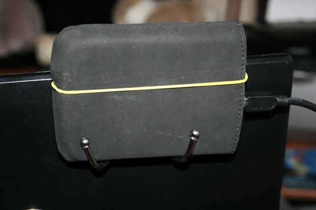 Así que aquí está mi solución extra barato - todo lo que necesitas es un par de cocina-carril-ganchos en S (disponibles en ferreterías ni aplicaciones de la casa) y una banda de goma (tienda ir a cualquier fijo o simplemente revolver alrededor en su escritorio).