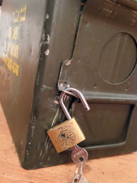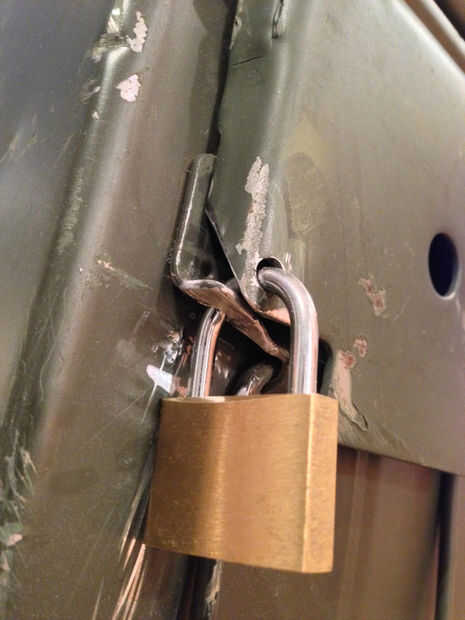 Agarra tu candado y sostenga para el pestillo cerrado para determinar donde los agujeros tienen que ir - usted no tiene que ser muy precisos en este paso. Marque los agujeros para taladrar y comenzar. Sólo asegúrese de que la broca es un poco más grande que el diámetro del grillete de su cerradura, de otra manera, más adelante va a ser difícil realizar el enganche a través de los agujeros. Otra vez la arena o los agujeros de archivo un poco para evitar los bordes filosos.