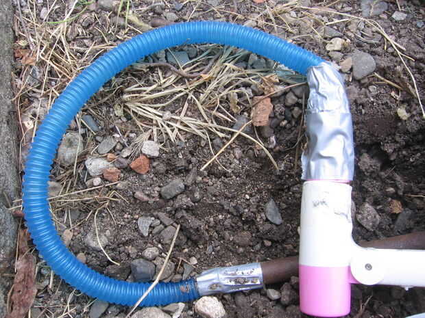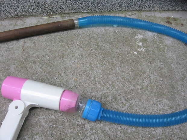 Cortar la botella en la parte superior y perfore un orificio en la tapa para que la manguera se puede venir a través. Deje un poco de la botella para que puede cubrir la abertura del secador de pelo. Conecte la manguera, la pipa y el secador de pelo y envolver las conexiones con la cinta pato.