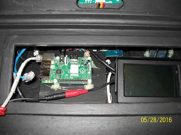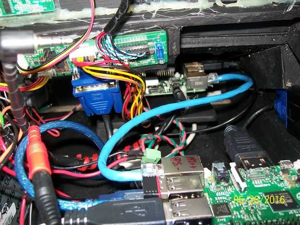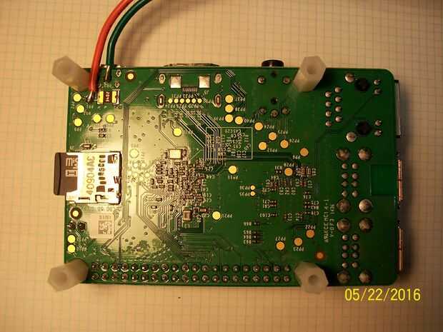 Usando las teclas de punto de prueba, había soldado lleva a PP1(Red) y PP3(Green), también coloqué un condensador electrolítico de 100uF en pastillas PP1 y PP3 (realmente de soldadura para los cables, luego aislar con calor del encogimiento). Esto ha estabilizado la oferta a la frambuesa Pi el arranque parece ser mucho más rápido y no hay ninguna notificación de baja potencia en la esquina superior derecha. Los cables se conectaron a un conector de bloque de tornillo en la línea de 5V (rojo).
