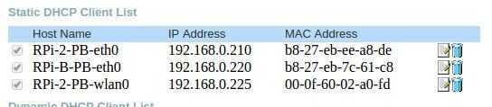Direcciones IP estáticas determinadas usando el router local. Prefiero este método ya que está previsto que en su mayor parte este proyecto no se conectará fuera de mi red. Utilizando la gestión de dhcp del router de red principal es una opción mucho más fácil y limpia. He puesto a un lado Dirección índice 200-255 para mi propio uso estático. Nunca se uso a todos.