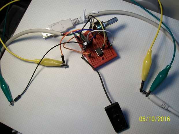 - El circuito LM386 trabajó maravillosamente en la placa, sin embargo en la construcción del circuito en placa de prototipo inadvertidamente invierte el voltaje a través del circuito. El IC se convirtió en agradable y caliente, y ahora no funciona. Esto fue demasiado malo, como lo fue el único LM386 que tenía.