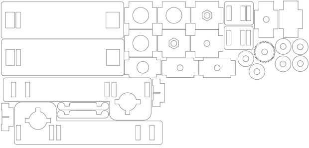 Una vez más, hay varias maneras de solucionar esto. No dude en utilizar estos dibujos para la inspiración, o descargar el adjunto "motor_chassis.dxf"-archivo para continuar recto hasta el corte por láser de las piezas MDF.