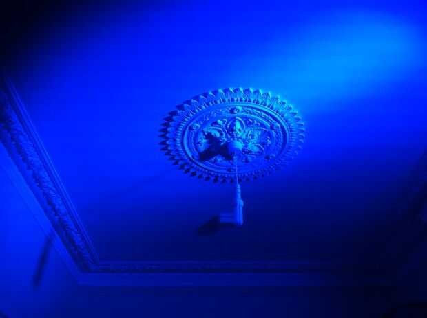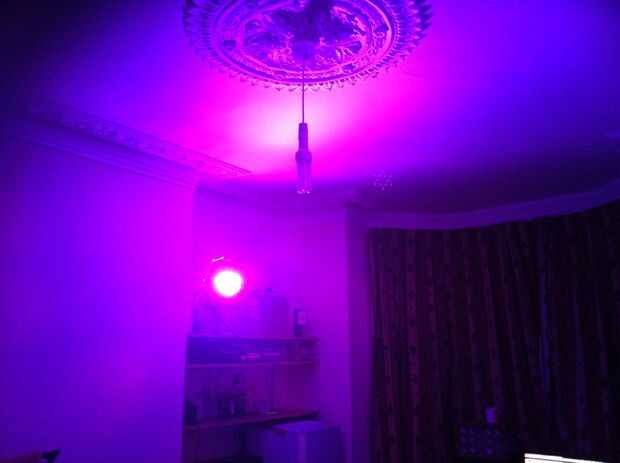 Imagen 1 muestra la luz colocada hacia arriba en un estante de libros. Otra vez esto impide la luz cegador personas pero ahora la luz ha sido angulada para hacer frente al central techo rosa. Esta perspectiva destaca el detalle de la escayola con contraste de sombras en el lado opuesto. Esto se ve realmente genial en persona pero no puede ser mejor que difunde la luz uniformemente alrededor de la habitación.