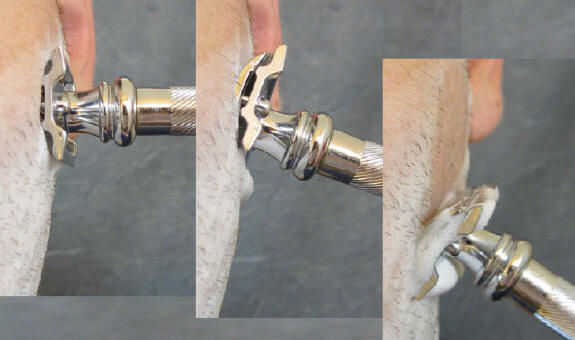 Antes de comenzar su primer paso, debe encontrar el ángulo correcto de la hoja. Comenzar colocando la cara de maquinillas de afeitar contra su cara (con la manija perpendicular a la cara). Baje lentamente el mango de la maquinilla de afeitar hacia el piso mientras tira la navaja por tu cara. Cuando el pelo empieza a cortar, habrá encontrado el ángulo recto!
