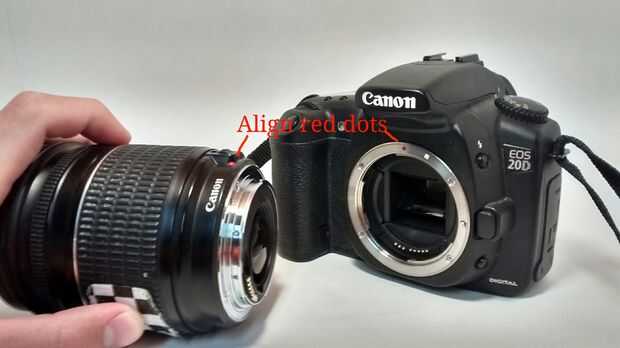 Para poner la lente en, alinee los puntos rojos en la cámara y la lente, empuje la lente (nota, si no se va, que ha no alineada a la derecha, no probar a fuerza el lente en, que voluntad, más o menos garantizado rotura tu querida cámara) entonces simplemente gírelo hacia la derecha, hasta ver/sentir/escuchar clic.