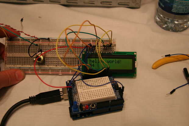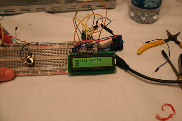 una vez que la pantalla LCD por cable hasta el arduino, cargar el sketch "Hola mundo" en los ejemplos del cristal líquido.