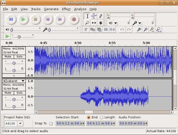 Audacity es un editor de sonido gratuito, bien recomendado disponible para Windows y Linux. Tiene una interfaz intuitiva que te permite importar, mezclar, editar y exportar proyectos sonoros multi-track. Fuera de la caja no puede guardar en formato MP3 pero esto rápidamente se fija mediante la descarga de un codificador de MP3 como LAME. No es un profesional de la edición de suite, así que no esperes una gran serie de características, pero es un montón capaz de la simple mezcla y efectos básicos.