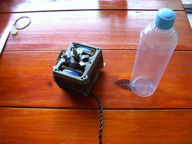 Encontré tres motorcitos eléctricos de 220 voltios y una botella vacía de endulzante (yo guardo incluido esas cosas). Elegí el motor de la foto. Proviene de un viejo, viejo, viejo tocadiscos (16, 33.3, 45 y 78 rpm)).