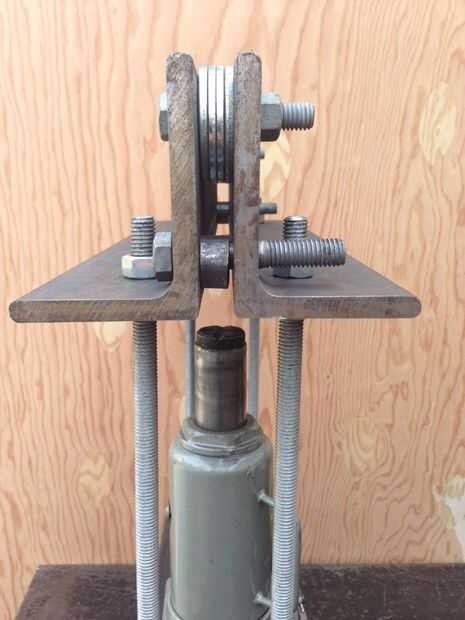 La segunda imagen es una vista lateral y le muestra un par de cosas: el perno superior es el tornillo espaciador y las arandelas de actúan para mantener los ángulos separados a la anchura correcta. Estoy doblando 1/2" material se ha acuñado la distancia a más de 1/2". Creo que las tuercas de perno espaciador son mejores si un poco floja: Esto permite que los ángulos para moverse un poco y mantiene grandes cargas por el espaciador de pernos. Durante el montaje, usted necesita hacer los ángulos todos una distancia de la viga inferior; Esto se hace por nivelación con las tuercas de la varilla roscada. Como la longitud de cuerda pernos tienen un simple pedazo corto de tubería de acero entre el ángulo para actuar como un rodillo de crudo. Como colocar carga en el sistema, estos rodará, así reduciendo la fricción en la pieza que se dobla y el tornillo. No he encontrado la necesidad de utilizar las tuercas en los pernos de longitud acorde, pero seleccionar pernos pesados que no se rosca para la longitud que está dentro de los ángulos. Esto puso la carga en una sección cilíndrica sólida del perno. (No creo que esto es fundamental, pero hace cosas más limpio que romper hilos en las primeras operaciones de pocos)