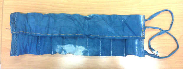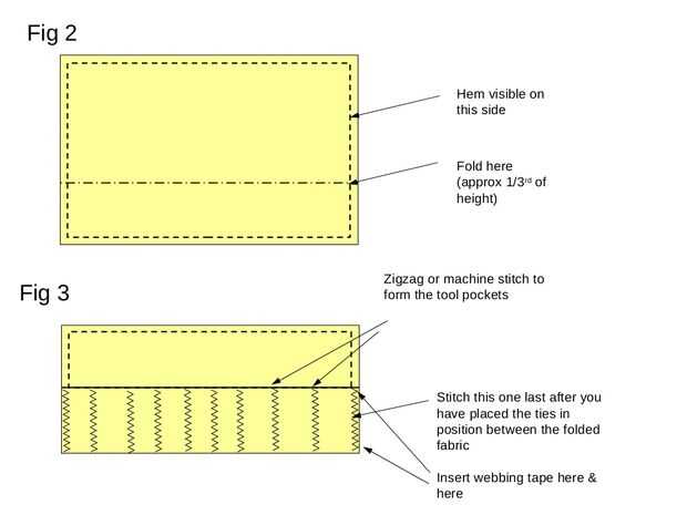 Una vez cosido, doblar la tela para formar los bolsillos de la herramienta, dejando suficiente material de la aleta Utilizar proporciones de 1/3, 1/3, 1/3.