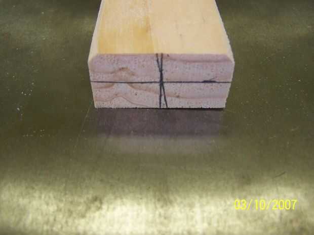 Uso la segunda 3/4 pedazo que cortó en el paso numero seis encontrar el centro de la pieza de ambos bordes y marcar una cruz en él. 1 1/2 gran parte de la tabla utiliza el triángulo de chatarra desde el paso 4 y ejecutar una línea de ángulo a través del centro de la Cruz.