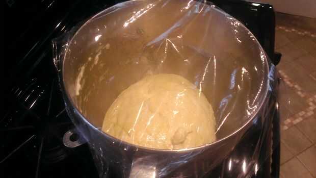 Vierta de nuevo agua caliente del grifo en la olla y coloque el recipiente de masa en la olla y la tapa con un pedazo de plástico.