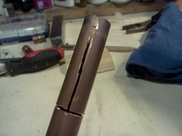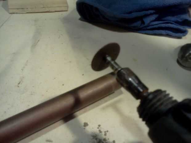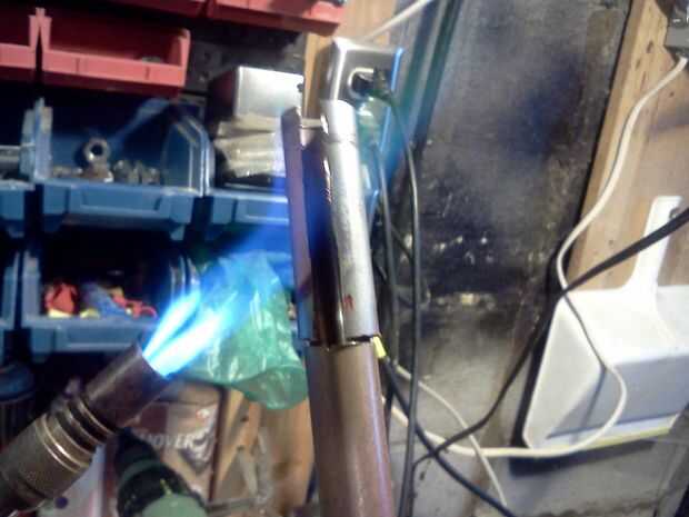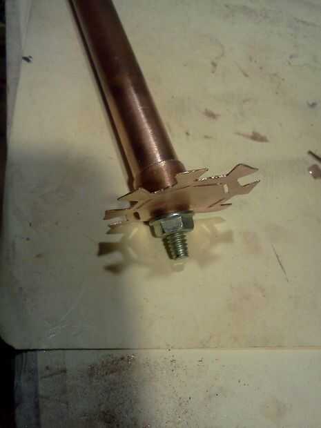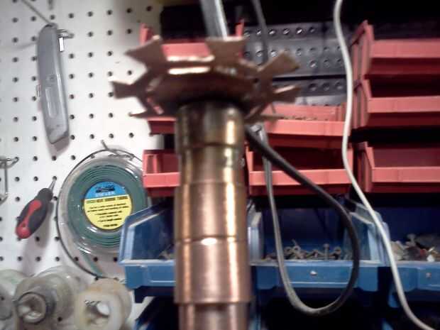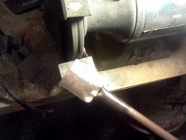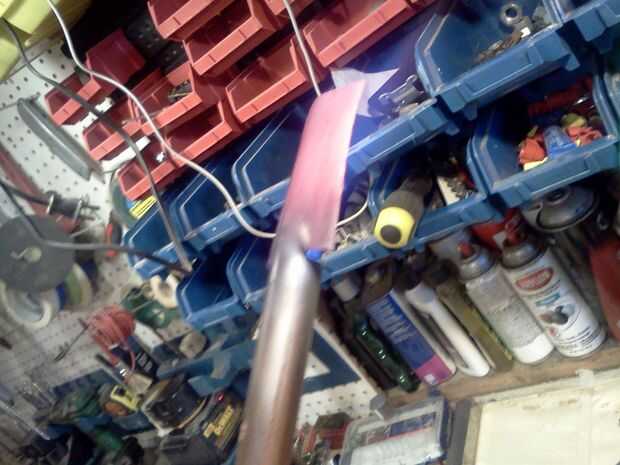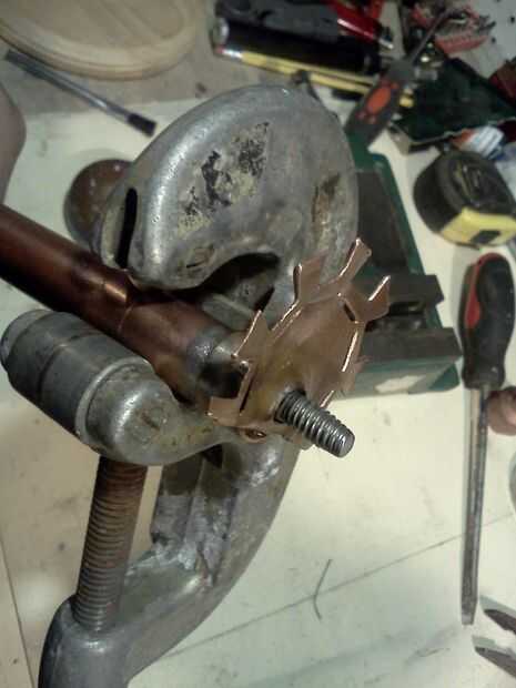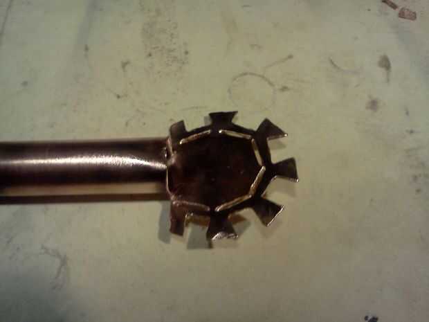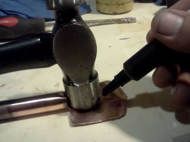 Hacer forma de T de corte en el extremo de un trozo de tubo de cobre, calentar hasta su rojo y trabajarlo hasta que esté plana.