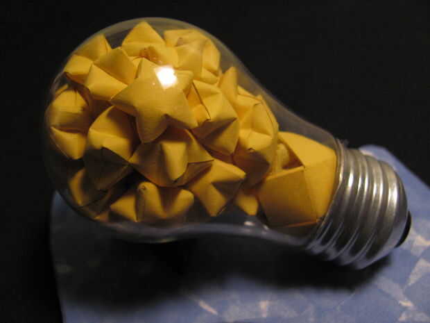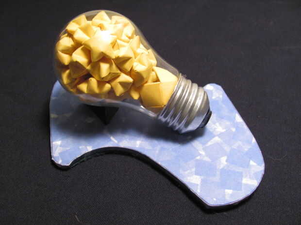 -Usted va a necesitar suficiente vidrio en la base caliente pegamento en una base de rosca separada permitiendo aún espacio suficiente remover las entrañas de la bombilla y llenar el globo con estrellas y su anillo de papel. Utilice su mejor juicio.