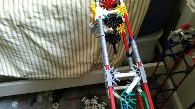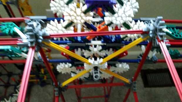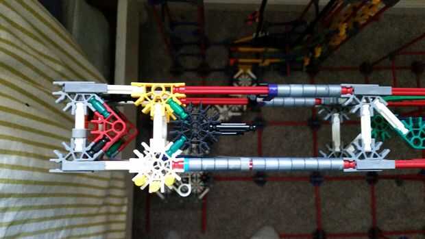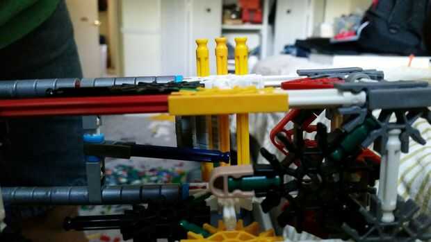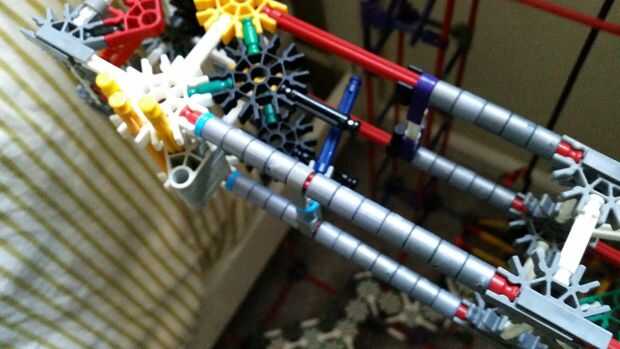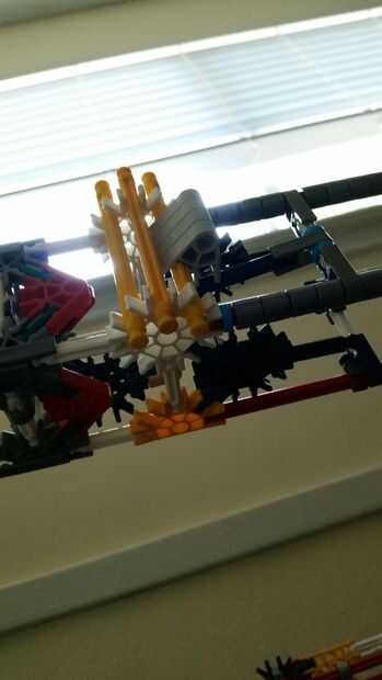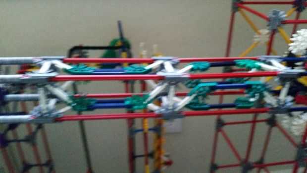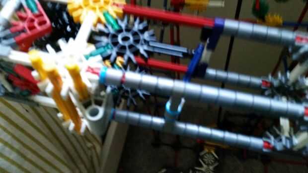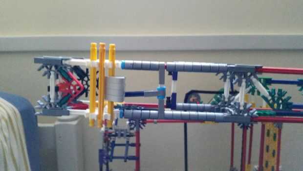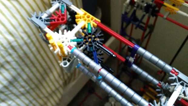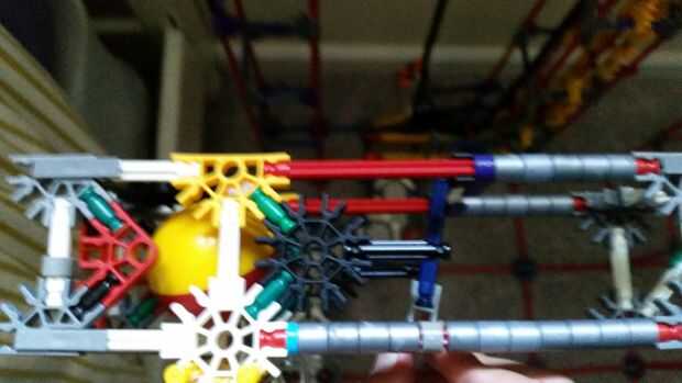 El ascensor recoge la pelota en el medio y levanta a la tapa. Sin embargo no puedo encontrar una manera para que la bola salga en la parte superior. Eso es lo que el conector gris y la barra azul para. El último par de fotos muestra lo que se supone para ocurrir. Pero la barra azul no está cayendo para permitir que la bola salga en la parte superior. En su lugar está deteniendo la bola en la parte superior y la bola no se mueve. Si puedes por favor hágamelo saber. Por cierto tengo pensado en poner las garras en el extremo para levantar bolas desde el fondo, así. Como una elevación del brazo.