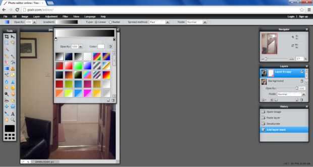 Seleccione el tipo de degradado y elegir el uno que mezcla desde el negro al fondo (representado como una cuadrícula de cuadros blanco y negro), cambiar el tipo de lineal a radial y la opacidad a alrededor del 80%.