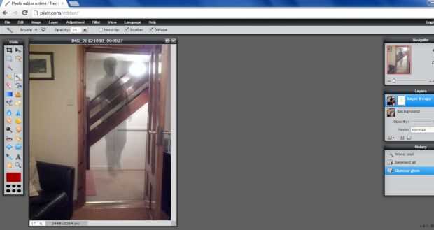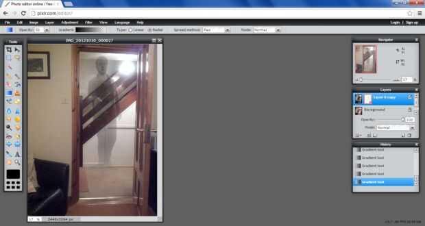 Mantener revelando su "fantasma" en porciones, puede utilizar Ctrl + z para deshacer los errores e inténtelo de nuevo hasta que usted siente que tiene una imagen bastante buena. Ajustar la opacidad de la herramienta de degradado como vas porque algunos detalles necesitan brillar más que otros, las tibias y los pies en particular deben ser descolorado más para ocultar la plataforma que está de pie sobre el tema.