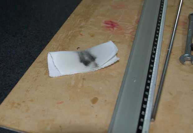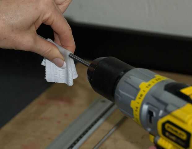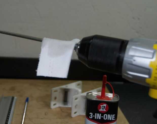 Varillas roscadas herida aproximadamente 3 capas de cinta de pintor azul alrededor del extremo del M5. Goteo aceite 3-en-uno en un pedazo doblado del paño libre de pelusas y Monte la varilla roscada en el taladro. Coloque el taladro en modo inverso y mientras apriete firmemente el aceite empapado el trapo entre los dedos, 'revertir' la tela hasta el otro extremo a un ritmo constante lento.