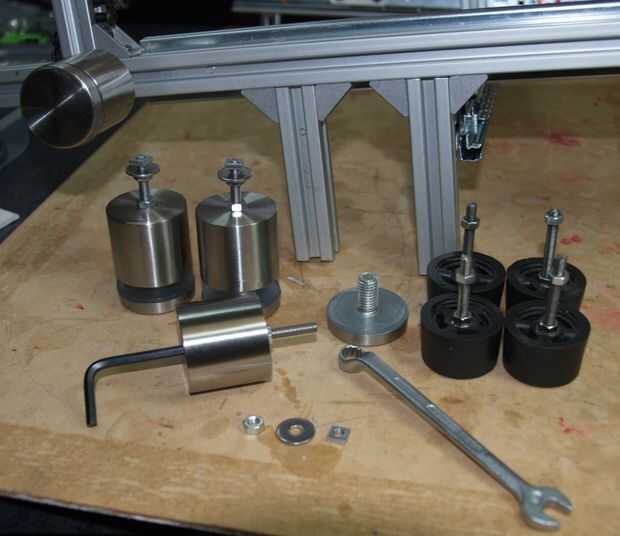 Con alguna varilla de sobra 5mm roscado, corte 4 piezas entre 5 y 6 cm de longitud. Taladro/agrandar los agujeros de centro en el doorstoppers de goma de 5 mm. ampliar (fregadero contrario) el agujero en la parte inferior de la doorstopper con el 8mm broca a una profundidad de aproximadamente 4 mm. Empuje el tornillo de la varilla de 5mm a través del agujero y agregar una pequeña M5 arandela y tuerca en la parte inferior, al ras con el extremo de la varilla roscada. Añadir una arandela M5 grande y una tuerca en el otro extremo. Utilice la llave de 8mm y cambio de llave para tirar de la arandela y tuerca M5 en el orificio de la parte inferior de 8mm que se encuentra justo debajo de la superficie de la parte inferior de la doorstopper. Añadir otra tuerca M5, M5 arandela grande y por último la tuerca cuadrada M5.