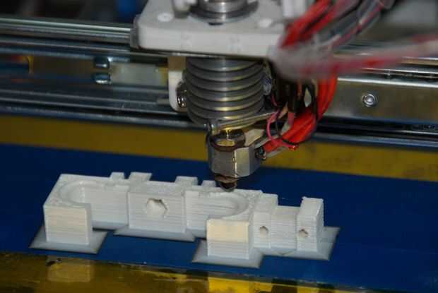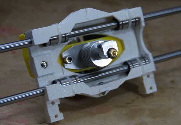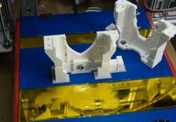 Hemos impreso un 'carro X Quick-Fit y extrusora - LM8UU, un excelente diseño de RichRap (http://www.thingiverse.com/thing:1959), en el video en el paso anterior. La parte a la derecha de la foto 3 fue impreso con una boquilla de 1mm y requiere cierta atención con un cuchillo stanley. La 2ª parte (todavía pegada a la cama de impresión) fue impreso con una boquilla de 0,4 mm - 0.3mm 'Calidad' y relleno de 30%. La tuerca M5 fue tirada en la trampa con la mínima cantidad de pelusa.
