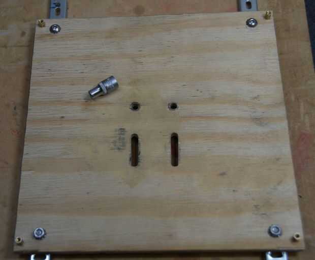 • Utilizar los otros dos conjuntos de cabeza de botón de M5 10mm, tuercas y arandelas para sujetar las guías a la madera contrachapada a través de los agujeros alargados de estrella indicaron en rojo (la cabeza del botón está en el lado del corredor y las arandelas y tuercas en el lado de madera). Por favor tenga en cuenta que tengo los corredores montado al revés en estos de la foto - las lengüetas plegables, junto a los agujeros marcados en rojo, en el extremo de la rueda loco.