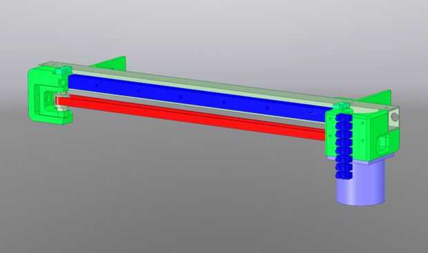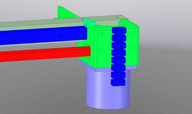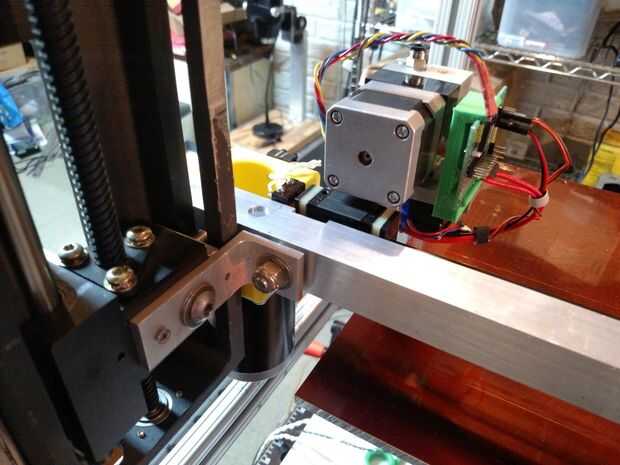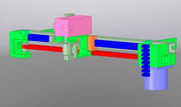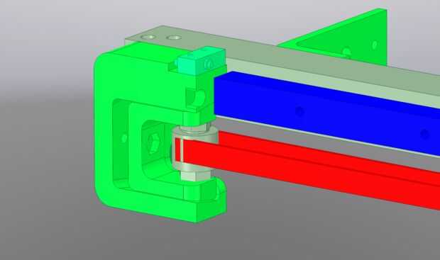 Usé un tubo de aluminio cuadrado de 1" como un boom para el eje X para apoyar todas las demás partes. Proporciona fijación fácil del montaje del motor, tensor de la correa y linear de la guía. Sobre la corta longitud del eje X es posible hacer sin el tubo de aluminio y montaje de la guía lineal directamente en los tornillos de eje de Z, pero luego tendrá que ingeniárselas sujetar todo lo demás.
