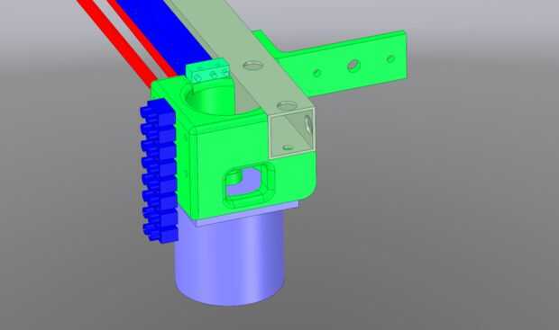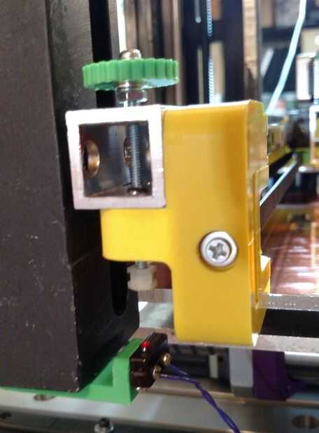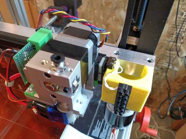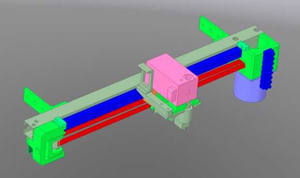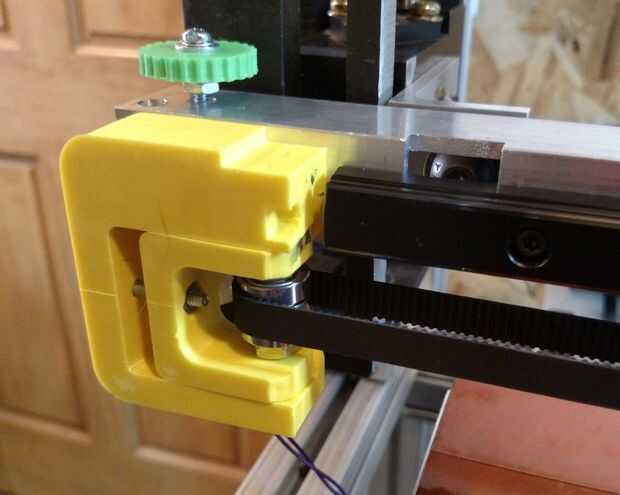 El montaje del motor, tensor de la correa y del cinturón son partes todo impresas (que algún día conseguir sustituir por piezas de aluminio molido). Montaje del motor incluye el interruptor de límite mínimo de X y hay espacio para montar un interruptor de límite máximo de X en el tensor del cinturón. El cable del interruptor del motor y el límite sólo pende de un lazo desde arriba para reducir al mínimo la flexión.