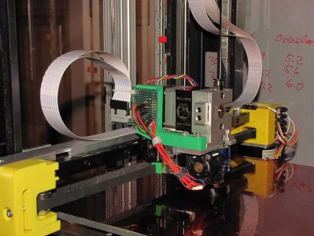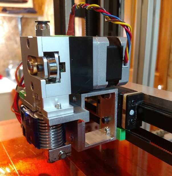 Uno de los primeros problemas que tuve cuando construí mi primera impresora fue extrusora jamming. Tomó meses para averiguar cómo obtener el estirador para trabajar con cualquier confiabilidad e incluso intenté mi mano en el diseño de mi propia. Para SoM, decidí encontrar una extrusora confiable y combo extremo caliente. Después de leer un montón de comentarios y analizar muchos diseños con un ojo crítico, colocó en la extrusora BullDog XL y el E3D v6 final caliente. En los cinco meses yo he estado usando que no he tenido para despejar un atasco de filamento único. El extrusor puede manejar filamento de 1,75 y 3 mm, y el extremo caliente se puede utilizar con cualquier tipo de filamento de 1.75 m m.