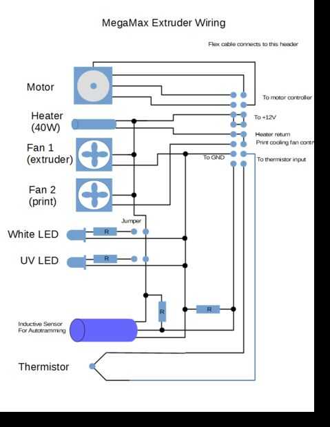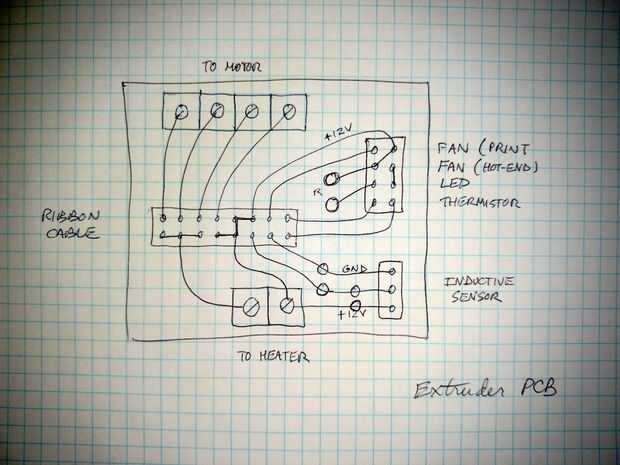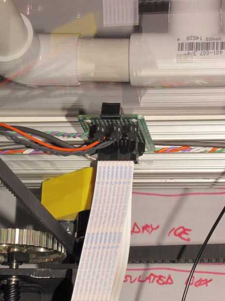 Después de experimentar una falla en cable de estirador de MegaMax debido a exceso de flexión (ver paso 12: fiabilidad) decidí usar un cable de cinta flexible del tipo utilizado para conectar a imprimir cabezas en impresoras de chorro de tinta para hacer todas las conexiones. Estos cables están diseñados para flex millones de veces sin falta. He utilizado un cable de un viejo robot de biblioteca de cinta. Tenía más que suficiente conductores así que corte lo longitud sabio en una cinta de 16 conductores. Uno de los extremos de la cinta se conecta a la placa de circuito en el carro de la extrusora y el otro en un circuito impreso en la parte superior del bastidor de la máquina. La cinta tiene suficiente conductores y la capacidad actual para conectar algunos extras como LEDs, ventiladores y un sensor inductivo para auto-tranvía (totalmente innecesario en SoM). El cable es un poco más largo que me gustaría, pero hace el trabajo y se queda fuera del camino.