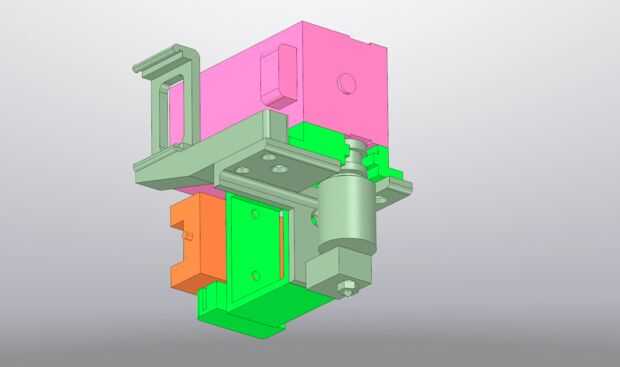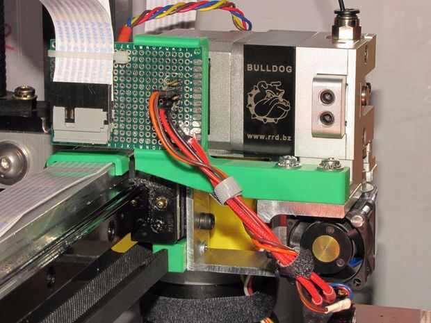 El carro de la extrusora se emperna a la guía linear del eje X y la abrazadera de banda impresa está atornillada en el carro. Lo más interesante sobre el carro de la extrusora es las conexiones eléctricas. Experiencia con MegaMax me enseñó que extrusoras/caliente-extremos a menudo necesitan mantenimiento así que hice fácil de quitar por connectorizing los cables y con solo dos tornillos para montar el estirador en el carro.