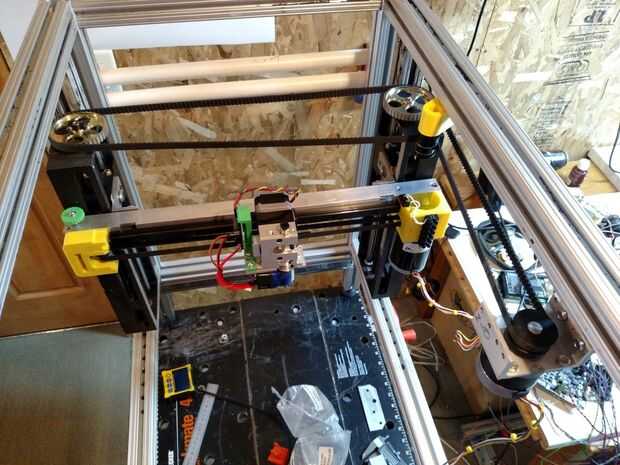 Una vez que un marco robusto, utilizando un solo motor con una correa para conducir los tornillos de eje de Z asegura que la estancia tornillos siempre sincronizados. Una vez usted alinea el eje de las X ortogonal a los ejes Y y Z que tendrás que alinear otra vez. Si desea aumentar el eje X para hacer algún trabajo en la extrusora, no hay para encender la impresora o una computadora y luego paso a través de varios menús para llegar a la posición de eje de mando de lanzadera. Todo lo que tienes que hacer es tirar la correa y el eje irá para arriba sin estropear su alineación con los ejes Y y Z.