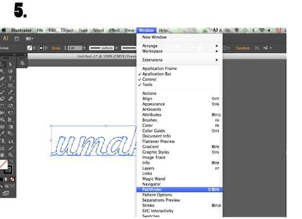 Seleccione los objetos, haga clic en el botón 'Ventana' en el menú principal y seleccionar 'PATHFINDER' en el desplazamiento hacia abajo de menú como se muestra en de la imagen 5.