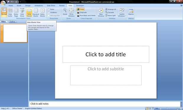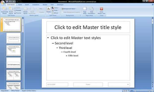 Para realizar cambios a tu tema en cada diapositiva solo, llevar el ratón a la izquierda de la pantalla y seleccione la primera diapositiva que se muestra allí (el Patrón de diapositivas del tema).
