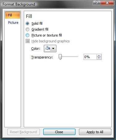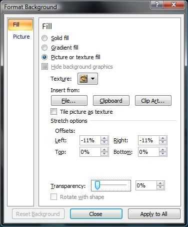 Haga doble clic en su selección o golpe OK y la imagen se mostrarán en el fondo de la diapositiva. Si el color es demasiado oscuro para su selección de color de fuente, utilice el control deslizante transparencia para hacer los colores dimmer.