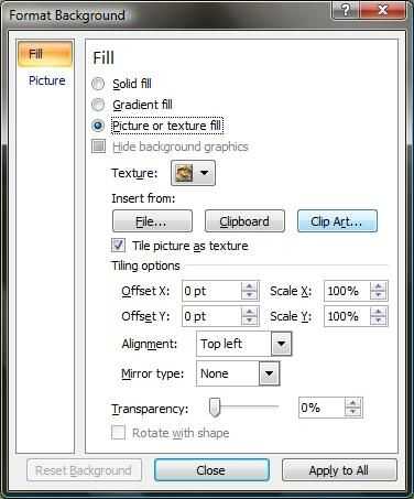En las opciones de relleno , seleccione el círculo al lado de relleno de imagen o textura.