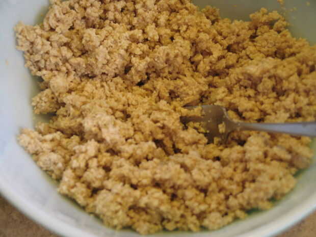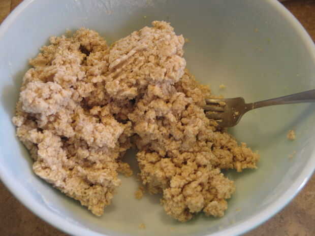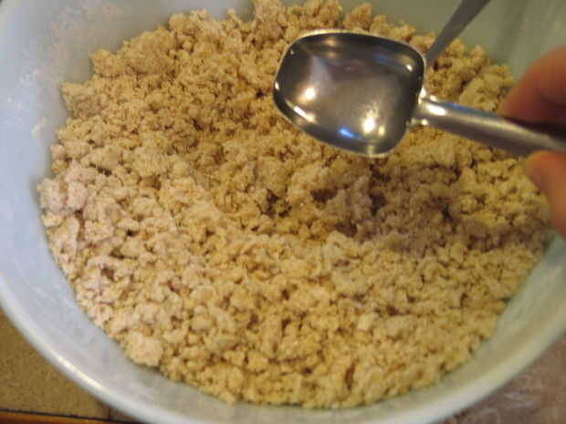 dos cucharadas de agua fría a la vez, mezclando con un tenedor. Seguir añadiendo agua fría hasta llegar a 6 cucharaditas o hasta que esté muy pegajosa. (ver