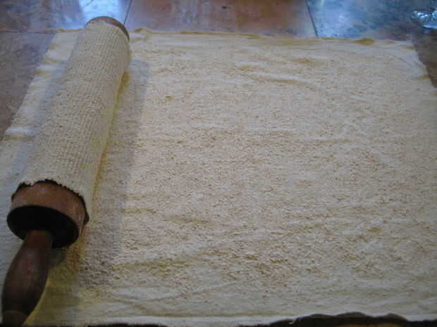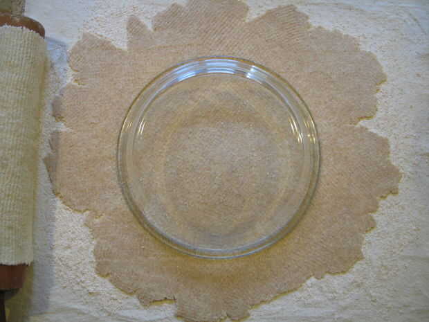 Mantener rodando hacia fuera hasta que quede una buena 2 pulgadas más ancha que la tartera de todo. (ver última foto)